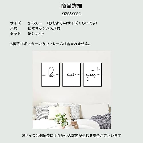 【モダンな空間】シンプルで洗練されたモノクロの手書き文字「be」「our」「guest」が、あなたの部屋をモダンな空間に変える3枚セットのアートポスターです。 【インテリアのアクセント】フレームを選ばないシンプルなデザイン。韓国インテリアにもマッチする、このポスターでお部屋に洗練されたアクセントを加えましょう。 【手軽なサイズ感】A4サイズで場所を選ばず、壁にも机にもかんたんに飾れる大きさ。インテリア初心者でも楽しめるサイズ感です。 【長持ちする美しさ】高品質の防水キャンバスを採用し、日焼けや色あせに強いため、長い間美しい状態を保ちます。 【簡単デコレーション】フレームは別売りですが、そのまま壁に貼るだけで空間が華やかに。お好みのフレームを選んで、さらに個性をプラスすることもできます。 【不正転売にご注意ください】「サラデママ」ブランドを購入できるのは店舗名が「ラウムリンド」と「サラデママ」のみです。当店の商品に2~3倍以上の値段を付けて不正転売している店舗を確認しています。お買い物の際はご注意願います。 - 271,021位ホーム&キッチン ( ) - 423位