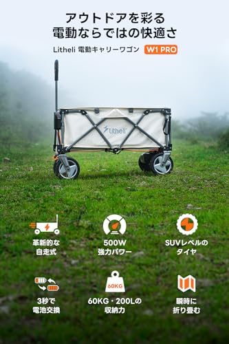 litheli w1 pro 電動キャリーワゴン 折りたたみ式 アウトドアワゴン 自走式 大容量 200リットル 無段階変速 u20バッテリー1個 子供用/キャンプ/引っ越し用