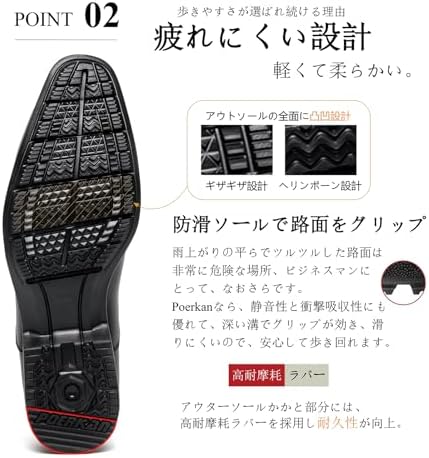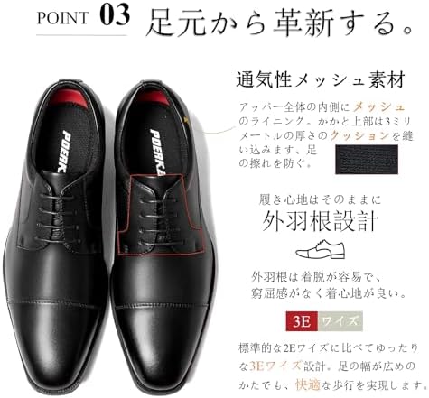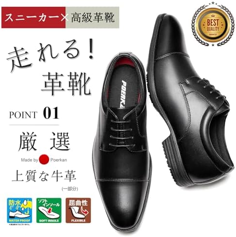 ★コスパ最高の革靴、アマゾンのビジネスシューズランキングで最も人気商品★当店オリジナル商品だからできる、コスパへのこだわり。工場と直接取引により、徹底的なコストカットを実現。 【3万足突破】累計30526足突破のPoerkan内羽根走れるビジネスシューズ。高級シワ止めの皮革を使用し高級感と歩きやすさを追求。日本人に最適な靴幅3Eを採用し92%のビジネスマンに支持された万能型ビジネスシューズ。 【外羽根設計】スタンダードな靴で履きやすさを重視する方は外羽根のプレーントゥがお勧めです。着脱がしやすく調節も簡単な外羽根式を好んで選ばれる方も多くいらっしゃいます。 【優れた耐久性・歩きやすい】アウトソールはEVAを使用しているので軽量でクッション性に優れています、また深く入った溝が屈曲性をかかとに配した滑り止めラバーが防滑性・耐久性を高めています。長持ちできるお得な一足です。 【あらゆるシーンで活躍】ビジネスシーンだけでなく、カジュアルな着こなしにも適しています。毎日の通勤・通学にはもちろん、卒業式、入学式、成人式、入社式、就活の面接、冠婚葬祭や式典などのフォーマルな場面のスーツスタイルに靴は必需品。 - 5,644位ファッション ( ) - 30位