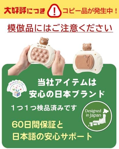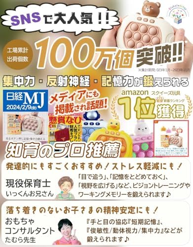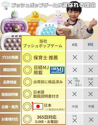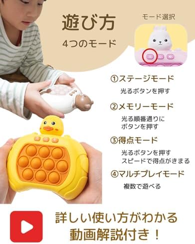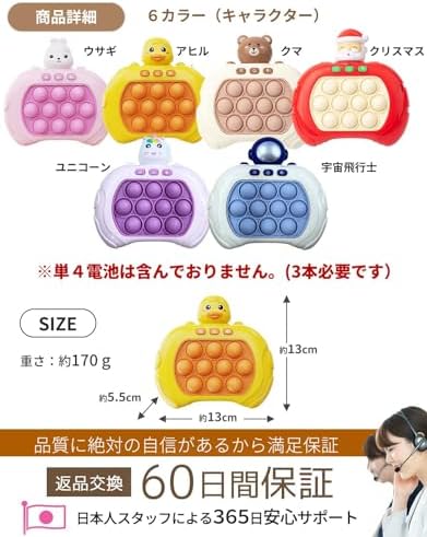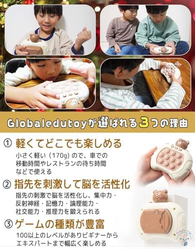 🧩【知育のプロ推薦】「現役保育士いっくんお兄さん」と「おもちゃコンサルタントたむら先生」の推薦!Globaledutoyのプッシュポップゲームは「目で追って押す」「記憶をとどめておく」「視野を広げる」など、ビジョントレーニングやワーキングメモリーを鍛える要素もあり、発達的にもすごくおすすめです。ストレス軽減にも繋がります。光るところを押す『手と目の協応』や光る順番を覚えて押す『短期記憶』、制限時間内に素早く押す『俊敏性・動体視力・集中力』などが鍛えられます。何かを触っておかないと落ち着かないようなお子様も精神安定に繋がるおもちゃとして推薦します。 🧠【6つの能力が鍛えられる】脳を発達させ集中力、反射神経、記憶力、論理的思考力、社交性、推理力が鍛えられます。①集中力:触っているうちに集中力が増していきます。②反射神経:瞬時に変わる光るボタンを押すことで素早い動きを養われます。③記憶力:どのボタンがまだ光っていないか、どこを押したか等を自然に覚えます。④論理的思考力:どのように押せば早く推せるか、ミスが少なくなるかなど論理的に考えるようになります。⑤社交性:一緒に遊ぶことでコミュニケーションを増やします。⑥推理力:パターンから次に光る個所を推測できるようになります。またストレス発散も期待できます。 🎉【Globaledutoyが選ばれる理由】①軽くてどこでも楽しめます。小さく軽い(170g)ので、車での移動時間やレストランの待ち時間などで使えます。②指先を刺激して脳を活性化し集中力・反射神経・記憶力・論理能力・社交能力・推理力を鍛えられます。③ゲームの種類が豊富なため(100以上のレベルで)ビギナーからエキスパートまで幅広く長くお楽しみ頂けます。 🐻【革新的なもぐらたたきゲーム】クセになるバブルポップの定番を高速で楽しむ電動ゲームです。高品質なABS素材を使用し、快適なタッチ感があります。お手入れが簡単です。また、耐衝撃性と耐久性にも優れ、ボタンが壊れにくい設計になっています。人間工学に基づいたデザインで、長時間のプレイでも手が痛くなりません。携帯に便利なサイズで、いつでもどこでもゲームを楽しめます。音量は調整可能で、静音にも設定できます。 🎮【操作方法はとても簡単】4つの楽しいゲームモード(①ステージモード②メモリーモード③得点モード④マルチプレイモード)があります。ランダムに点灯するボタンを覚えて、正確かつ迅速に押して各レベルをクリアしましょう。もし間違えた場合は、ゲームオーバーになります。各モードには異なる難易度レベルがあり、子供たちの反応速度、記憶力、協調能力を鍛えるのに役立ちます。 🎁【特別な瞬間を彩る最高の贈り物】クリスマス、お誕生日などの特別な日のプレゼントにピッタリです。安全で楽しく、知育にも最適な子供向けのおもちゃです。一緒に遊ぶことで親子の絆も深めてくれること間違いなしです。 🔋ご使用には単4乾電池3本が必要です。製品には含まれておりませんので別途ご用意する必要がございます。製品に電池を挿入したらまず電源ボタンを押して起動します。次に、製品の背面にある確認ボタンを押してゲームを開始してください。※ライトの点灯色は赤・緑のいずれかとなります。お選びできないことをご了承ください。もしボタンが動かない場合は、一度電源を切り電池の入れ替え、再起動をお願いします。