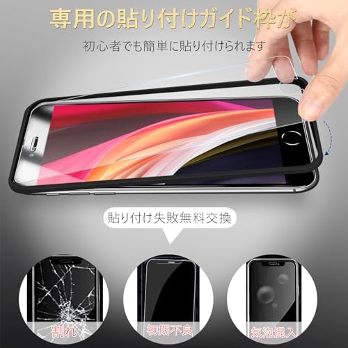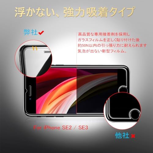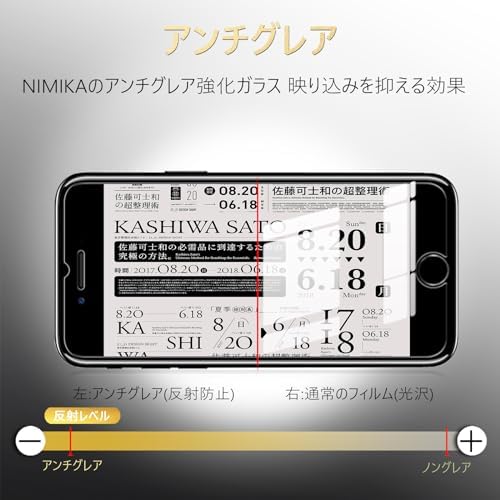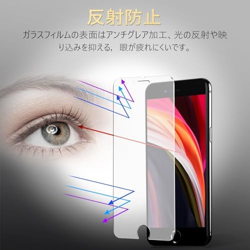 【対応機種】 iPhoneSE 第2世代(2020) / iPhoneSE 第3世代(2022)用(4.7インチ対応)。 【パッケージ内容】 iPhone SE ガラスフィルム * 2枚セット + ガイド枠 * 1枚セット。 【アンチグレア加工、 反射防止】 MINIKAのいPhoneSE2 アンチグレア フィルムの表面は反射防止タイプで、光の反射や映り込みを抑え、光の反射が少なくて見えやすく、長時間で、スマホ の画面を見ていたり、Youtubeを視聴しても、眼が疲れにくいです。3Dタッチにも対応し、スムーズに操作する事ができます。 【指紋防止、サラサラ手触り、ゲーム用】 MINIKAのiPhoneSE3ガラス保護フィルムの表面を顕微鏡で見ると、スクラブ保護フィルムはボコボコと凹凸が見えます。この凹凸は人間の指では段差として感じることはなく、触れる面積が減るため一般的な強化ガラスと比べるとサラサラとした使用感になるのです。表面が「さらさら」としているので、快適にゲームやフリック操作することが可能です。最新なゲーム体験をしたい方には絶対オススメしたいと思います。 【ガイド枠付き、初心者でも綺麗に貼れる】 ガイド枠をはめる→上側に合わせて、フィルムを置く→軽く押すだけで自然に吸着。初めての方でも簡単に貼り付けられるよう、専用の貼り付けガイド枠を同梱しています。アイフォンSE スマホ フィルムがズレることなく、だれでも簡単にフィルムを貼ることができます。 【高品質素材、傷や衝撃に強い、ケースと干渉せず】 9H表面硬度ガラスを採用しています。スマートフォンがカバンの中で、鍵などの鋭いものにぶつかっても傷が付きにくく、あいふぉんSE2の画面をしっかり保護します。2.5Dラウンドエッジ加工が施されており頑丈でありながら、装着後もスマートフォンのデザインを損なわず、ケースとの相性も抜群です。