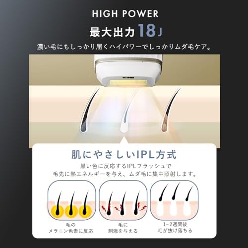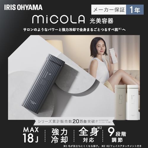 “最大18J”のハイパワーと冷却機能で全身に使える。MiCOLA(ミコラ)のIPL光美容器。[最大18J/9段階調節/クール機能/全身対応] 【肌にやさしいIPL方式】肌への負担が少ないIPL方式。 【刺激や熱さを抑える冷却機能】肌にふれる照射面のサファイアクリスタルを冷却。冷却ジェルが不要だから手軽にケアできる。 【9段階の照射レベル】自分のお肌に合わせて照射パワーを細かく調整できるから、部位に合ったムダ毛ケアを実現。 【顔からつま先まで全身対応】付属のアタッチメントを付けることで、敏感な部位にも使える。全身まるごとケアが可能。(※顔・IOゾーンに使用する際は、専用アタッチメントを取り付けしてから使用してください。専用アタッチメント取り付け時にはデリケートモードランプが点灯します。) 【照射回数約30万回】家族で使える長寿命ランプ。足や脇だけでなくヒゲにも使えるから、家族やパートナーとシェアして使える。 【インテリア性の高いデザイン】生活に馴染みやすく、置き場所に困らないデザイン。保管や持ち運びにも便利な収納袋付き。 - 178,690位ホーム&キッチン ( ) - 209位