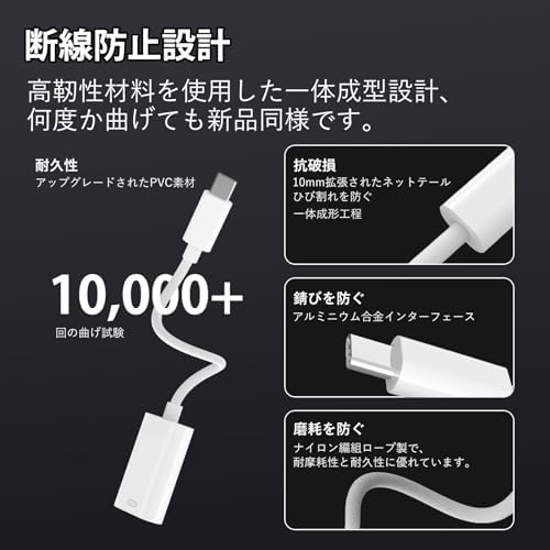 【Lightning to Typec 変換アダプタ】本製品はLightningアクセサリーをUSB Type-C端子対応の新型iPhone 15およびiPad/Macなどに接続するための変換アダプタです。27Wの急速充電とデータ送信機能をサポートします。最大100WのPD急速充電ケーブルと急速充電ヘッドを接続して急速充電を完了することもできます。転送速度最大480Mbpsを対応します。(ご注意:本製品イヤホンオーディオ再生、Apple Pencil、OTG およびその他の機能と互換性がありません。) 【ナイロン編み素材】本製品のケーブルはナイロンブレード素材を使用しており、耐久性に優れ、切れにくいです。 何度曲げても新品同様です。10mm延長されたネットテールは製品の破損を効果的に防止し、アルミニウム合金製のインターフェースは製品の錆を防ぎ、より長い耐用年数を持ちます。 【持ち運びが容易】軽くて小さいサイズなので、持ち運びが便利で、旅行、仕事などの場合でも、アダプターケーブルを持ち歩くだけで、さまざまな種類の電子製品の使用を簡単に変換できます。入および取り外しができるため、スマートフォンを傷つける心配はありません。 より耐久性があり、より安全です。軽量小型トなサイズで収納しやすく持ち運び便利です。 【幅広い互換性】プラグ&プレイ、USB C アダプターにはドライバーは必要ありません。アダプターを携帯電話に接続し、充電ケーブルに接続するだけで使用できます。iPhone 15、15 Pro、15 Pro Max、15 Plus、iPad Pro、iPad Air 4/5、iPad mini 6、iPad 10、MacBook Pro/Air、iMac、などのデバイスに対応。 【品質保証】実験室で1万回以上挿し直しテストをしており、品質保証がつける上に、丈夫で長持ちすることができます。12ヶ月の保証を提供しております、製品に不具合が生じた場合は、アマゾンの購入履歴よりご注文番号を用意して、弊社にご連絡いただければ、弊社の営業担当が至急に対応いたします。無料交換あるいは全額返金対応が可能です。