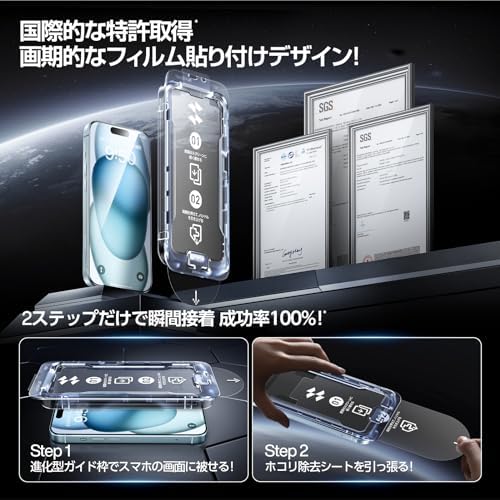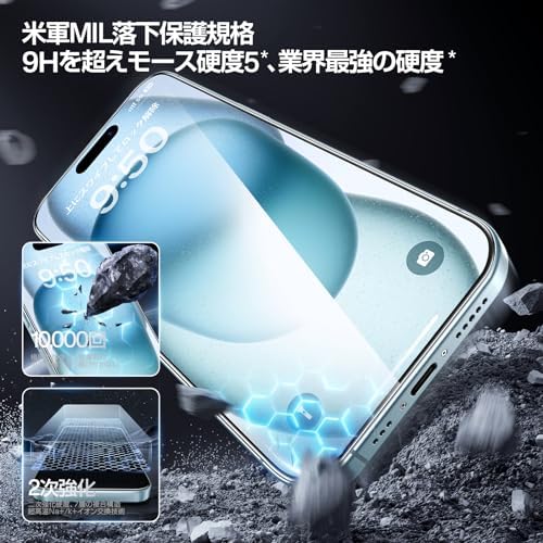 【対応機種・アフターサービス】ご覧になられているガラスフィルムはiPhone15用(6.1インチ)に対応しております。⭐万一、初期不良やご使用中にホコリ、気泡、割れが発生した場合があれば、ご遠慮なく、弊社とお気軽にご連絡してください。365日の保証期間内に、お客様からのお問い合わせ内容に応じて1回の代替品交換・返金対応を提供致します。貼り付け方の動画は取扱説明書内のQRコードからご確認いただけます。 【画期的なフィルム貼り付けデザイン・初心者でも簡単に貼り付け】自分でフィルムを貼り付けると、ズレや気泡、ホコリ、端浮き、浮遊物などの問題がよく起こってしまうけれども、初心者でも簡単に貼り付ける進化型ガイド枠が登場します!2つのステップだけ、超簡単に貼り付けできます!進化型ガイド枠でiPhone 15の画面に被せて、ホコリ除去シートを引っ張ります! 【業界最強の硬度水準・5倍以上の耐衝撃性】SGS米軍落下保護規格の認証を取得しました!※米軍「MIL-STD-810H」規格認証番号:GZHL2311040506SD|Nov 20,2023 二次強化硬度と7層の複合構造で、超高温Na+/k+イオン交換技術など、多くの画期的な加工技術を採用し、9Hの硬度を超えるモース硬度5を実現します。10,000回の極限耐摩耗性テストで、小刀や鍵などの鋭利な物品でも擦り傷が付かられないです!また、厚い発散防止緩衝層によって、衝撃吸収を最大化し、破片が落ちたり飛び散ったりしなくて、お客様のスマホの画面を本当に保護し、絶対的な安心感を提供いたします! 【色透過率100%・無類の一体感】2.5Dラージアークエッジデザインにより、手を傷つける危険性がなくて、どの角度からでも優しくて滑らかな手触りを提供いたします!死角がなくジャストフィットのスクリーン保護があり、黒い端なしでフルスクリーンにマッチし、100%スマホケースに対応し、ケースと干渉がなく完璧です!最新光学ガラス技術を通じて、無色透明で、ほぼ100%の透過率を達成します!0.3mmの薄みで機敏なタッチ反応と見えない保護を両立し、ゲームと文字入力がスムーズに途切れず、抜群のタッチ感があります。臨場感があふれる超クリアな画質を取り戻し、画像ロスがゼロで、クリアなオリジナル画面体験を満喫します! 【究極のスムーズな感触・指紋防止】ハスの葉を模倣したAFテクノロジーや日本信越製防汚コーティング剤を採用し、耐水性、耐油性、耐指紋性を持つ防汚ナノコーティングが形成され、指紋を気にすることなく日常的に使用し、画面を綺麗に保つできます。極限摩擦を10,000回繰り返しても、究極の滑らかな高感度タッチを保ち続けます。1億3700万人を超えるユーザーから絶賛され、非常に優れたご利用体験となっております。実物機種で1:1ベースの金型製作に基づいて、iPhone15のための最も適した強化ガラスフィルムで、貼付け時の失敗が大幅に軽減されます。