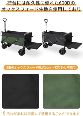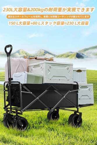 【Carry Long Luggage - Open Back】 The back of the carry cart can be easily opened by simply removing the buckles on both left and right sides. Stress-free carrying long camping gear that is difficult to use with a standard wagon, such as a freestanding hammock or tarp pole. In particular, when using a dedicated table for the wagon, the rear opening and closing feature allows you to easily access the items inside and move smoothly. In addition, this design also makes cleaning in the camp wagon convenient and even more convenient. For users, it is easy to carry long outdoor items Large Capacity & Incredibly Compact Storage: The ideal outdoor wagon boasts an amazing 230L capacity and a load capacity of 440.9 lbs (200 kg). It is an ideal choice for efficient carrying outdoor supplies, food and other essentials at once. The carrier is 34 cm tall and measures 75 cm deep x 46 cm wide x 48 cm high when stored: 47 cm deep x 14 cm wide x 66 cm high. This product is essential for outdoor activities such as camping and family picnics, and its large capacity yet compact design allows you to carry everything you need efficiently Multi-functional Large Tires & Brakes: This camping cart has extra-thick tires that are 6.7 inches (17 cm) in diameter and 3.9 inches (10 cm) in width, and the built-in bearings allow for a quiet and stable ride. Not only can it be used in flat areas, but it can also smoothly move uneven roads such as sandy beaches, gravel roads, and lawns. It has a unique brake function so you can rest assured even on slopes. Double front brake and oversized 360° swivel wheel (width: 10cm, diameter: 18cm) can be used on slopes, lawn, beach and even on uneven surfaces. The large removable tires can be stored space and can be changed at any time. Multi-functional carry cart with stable transport and braking convenience in all terrains Sturdy Design: The carry wagon uses an easy-to-use adjustable handle that can be stretched compactly when not in use. It is durable and has an amazing load capacity of 244.6 lbs (12Cart frame (thickness: 1mm), heavy duty tire bearings, hardened base plates (thickness: 4mm), and abrasion-resistant tires for added durability. The removable and easy-to-care construction allows for comfortable maintenance without worrying about staining after use. Sturdy frame made of steel tubular and 600D oxford cloth make it waterproof and durable, non-slip handle provides easy grip and maneuverability. This model has a longer life span than the market model, and can handle the toughest outdoor environments Portable & Convenient Storage: This carry wagon is ready to use without any assembly required. Easy to fold with just a pull, convenient to carry. Perfect for shopping and traveling, easy to transport your luggage and save time and effort. It can be stored freestanding with a single touch, and comes with a storage cover so you don't have to worry about dust. It does not get in the way when stored compactly, and can be used for vertical or horizontal display. Quick set up and fold down easily in 1 minute, this convenient carry wagon can efficiently store large items
