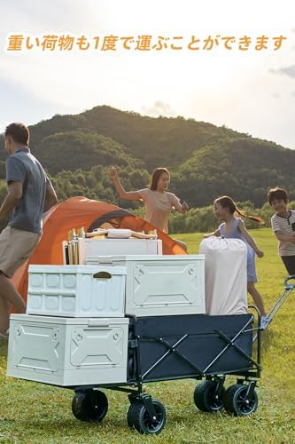 【Carry Long Luggage - Open Back】 The back of the carry cart can be easily opened by simply removing the buckles on both left and right sides. Stress-free carrying long camping gear that is difficult to use with a standard wagon, such as a freestanding hammock or tarp pole. In particular, when using a dedicated table for the wagon, the rear opening and closing feature allows you to easily access the items inside and move smoothly. In addition, this design also makes cleaning in the camp wagon convenient and even more convenient. For users, it is easy to carry long outdoor items Large Capacity & Incredibly Compact Storage: The ideal outdoor wagon boasts an amazing 230L capacity and a load capacity of 440.9 lbs (200 kg). It is an ideal choice for efficient carrying outdoor supplies, food and other essentials at once. The carrier is 34 cm tall and measures 75 cm deep x 46 cm wide x 48 cm high when stored: 47 cm deep x 14 cm wide x 66 cm high. This product is essential for outdoor activities such as camping and family picnics, and its large capacity yet compact design allows you to carry everything you need efficiently Multi-functional Large Tires & Brakes: This camping cart has extra-thick tires that are 6.7 inches (17 cm) in diameter and 3.9 inches (10 cm) in width, and the built-in bearings allow for a quiet and stable ride. Not only can it be used in flat areas, but it can also smoothly move uneven roads such as sandy beaches, gravel roads, and lawns. It has a unique brake function so you can rest assured even on slopes. Double front brake and oversized 360° swivel wheel (width: 10cm, diameter: 18cm) can be used on slopes, lawn, beach and even on uneven surfaces. The large removable tires can be stored space and can be changed at any time. Multi-functional carry cart with stable transport and braking convenience in all terrains Sturdy Design: The carry wagon uses an easy-to-use adjustable handle that can be stretched compactly when not in use. It is durable and has an amazing load capacity of 244.6 lbs (12Cart frame (thickness: 1mm), heavy duty tire bearings, hardened base plates (thickness: 4mm), and abrasion-resistant tires for added durability. The removable and easy-to-care construction allows for comfortable maintenance without worrying about staining after use. Sturdy frame made of steel tubular and 600D oxford cloth make it waterproof and durable, non-slip handle provides easy grip and maneuverability. This model has a longer life span than the market model, and can handle the toughest outdoor environments Portable & Convenient Storage: This carry wagon is ready to use without any assembly required. Easy to fold with just a pull, convenient to carry. Perfect for shopping and traveling, easy to transport your luggage and save time and effort. It can be stored freestanding with a single touch, and comes with a storage cover so you don't have to worry about dust. It does not get in the way when stored compactly, and can be used for vertical or horizontal display. Quick set up and fold down easily in 1 minute, this convenient carry wagon can efficiently store large items