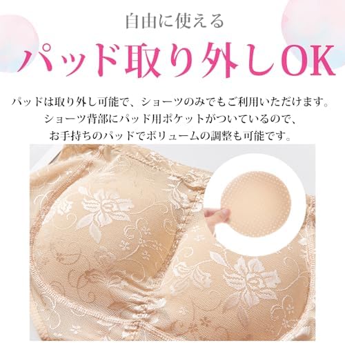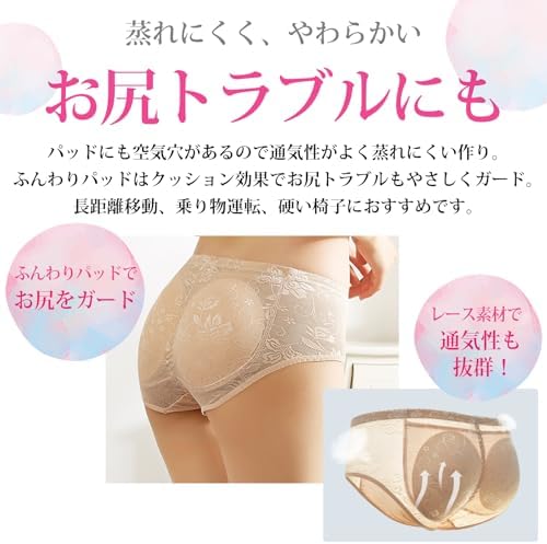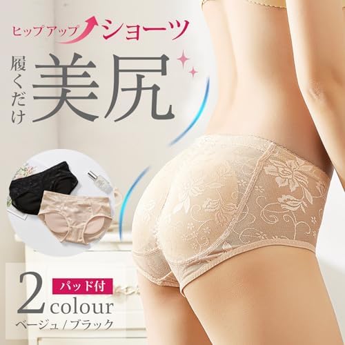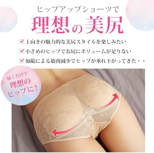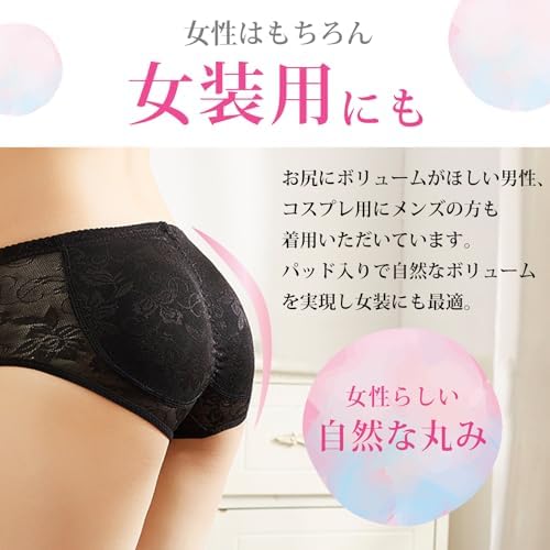 【ヒップアップショーツで理想の美尻】 上向きの魅力的な美尻スタイルを楽しみたい、小さめのヒップでお尻にボリュームが足りない、加齢による筋肉減少でヒップが垂れ下がってきた方のためのパッド入りショーツです。 履くだけで理想のヒップラインに! 【女性はもちろん女装用にも】 お尻にボリュームがほしい男性、コスプレ用にメンズの方も着用いただいています。 パッド入りで自然なボリュームアップを実現し女装にも最適。 【パッド取り外し可】パッドは取り外し可能でショーツのみでもご利用いただけます。ショーツ背部にパッド用ポケットがついているので、お手持ちのパッドで、ボリュームの調整も可能です。 【蒸れにくく、お尻トラブルにも】素材は、ポリエステル繊維、スパンデックス+綿を使用。レースなので、ガードルや綿ショーツではセクシーさが物足りないという方にぴったり。パッドにも空気穴があるので通気性がよく蒸れにくい。ふんわりパッドなのでクッション効果でお尻トラブルもやさしくガード。長距離移動、乗り物運転、硬い椅子におすすめです。 【美脚効果も】ヒップのトップ位置がキュッと上がるので、足長効果も。パンツやスカートの下に履くだけでスラっと美脚に。 【セクシーな柄】レース装飾がセクシーさをプラスし、黒色は万能な着こなしに、肌色は白など透けやすいボトムスにぴったり。 - 106,220位ファッション ( ) - 270位