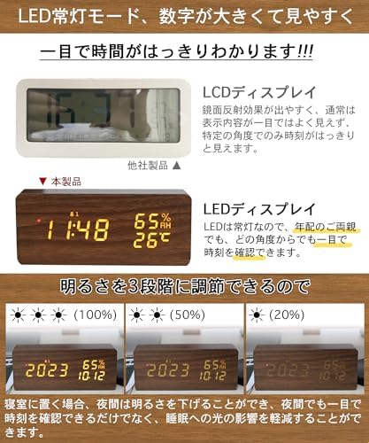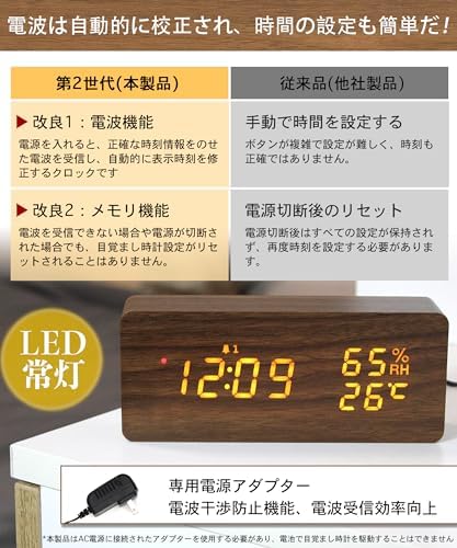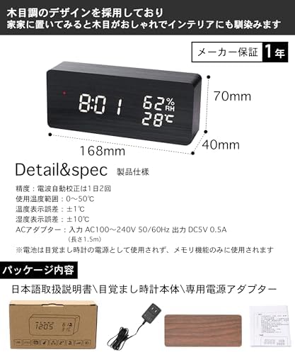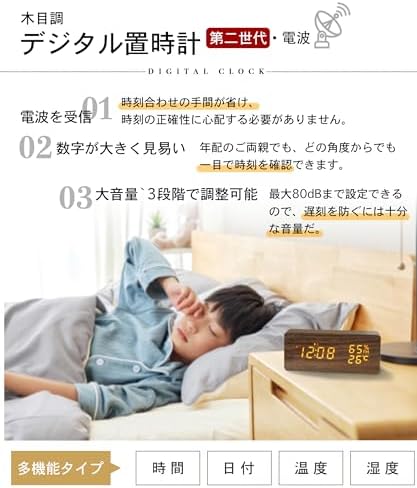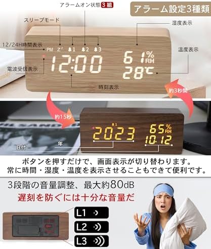 【12ヶ月安心サポート】お買い上日よりの保証期間がついております、初期不良、欠陥品場合は早急に対応致しますので出品者連絡でお問合わせください。注文履歴より「出品者へ連絡」からご連絡をお願い申し上げます、返金・無料交換可能。 【電波を受信】市販の似た外観の置き時計と異なり、この製品には電波校正機能があります。電源を入れると、正確な時刻情報をのせた電波を受信し、自動的に表示時刻を修正するクロックです、時刻合わせの手間が省け、時刻の正確性に心配する必要がありません。2本のアルカリ乾電池を挿入すると、デジタル時計のメモリ機能がアクティブになり、電波を受信できない場合や電源が切断された場合でも、 電波置き時計設定がリセットされることはありません。(電池は電波時計の電源として使用されず、メモリ機能のみに使用されます) 【数字が大きく見易い】この置き時計には常灯LEDディスプレイが搭載されており、LCDディスプレイを搭載した市販の電波デジタル時計の多くとは異なり、特定の角度にいなくても時刻をはっきりと見ることができる。 年配のご両親でも、どの角度からでも一目で時刻を確認できます。 また、3つの異なる明るさ段階を設計しており、デジタル時計を寝室に置く場合、夜間は明るさを下げることができ、夜間でも一目で時刻を確認できるだけでなく、睡眠への光の影響を軽減することができます。 【大音量】電波目覚まし時計の音量は背面のボタンで調整でき、最大80dBまで設定できるので、遅刻を防ぐには十分な音量だ。 アラーム時刻は同時に3組まで設定でき、日本語の取扱説明書が付属しているので、簡単にアラーム設定ができます。 温度と湿度も表示されるので、温度や湿度の変化に対応した調整も簡単です。 【おしゃれ】一般の置き時計とは異なり、このデジタル時計の外観は木目調のデザインを採用しており、家家に置いてみると木目がおしゃれでインテリアにも馴染みます。自分用や贈り物にも非常に適しています。