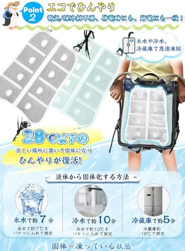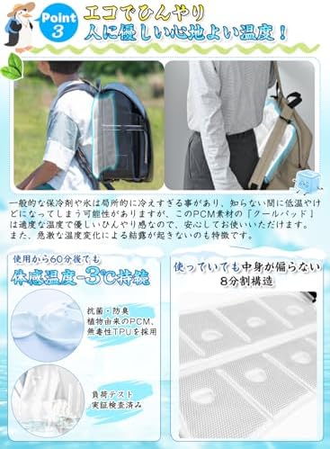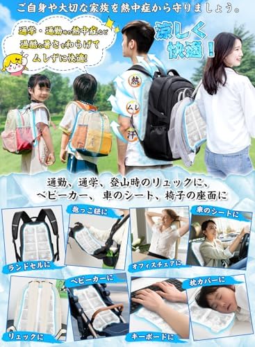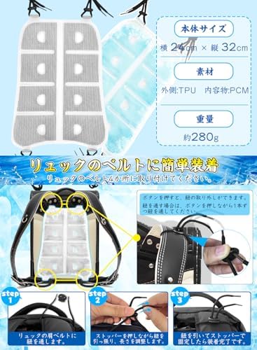 ⛄【瞬間冷感パッド、バックパック派の背中蒸れ・汗対策に!】⛄暑い炎天下、ランドセル バックパック リュックを背負っていると汗を大量にかいて不快感マックスですよね。そんな時、この背中の蒸れ、汗対策に効果抜群で、夏定番のリュック用クールパッドをご紹介します。バックパック用冷却パッドは次世代のPCM素材を採用、28度以下で自然に凍結するため、長時間使用しても凍傷の心配がなく、繰り返し使えて瞬時に冷たくなる熱中症対策グッズ!リュック用冷却シートは暑い夏の通勤・通学など、外出時の背中の熱ごもりと汗を軽減するために役立つ、リュックはもちろん、ランドセルにも取り付け可能。背中冷却パッド炎天下で通学するお子様の暑さ対策グッズの一つとしておススメです。 ⛄【28℃以下で自然凍結&体感温度マイナス7度!】⛄リュックの蒸れ防止に役立つ冷却シート・冷感シートはPCM素材を採用し、水より軽くて、瞬時に冷たくなる特殊冷感素材です。PCMはヤシ系のパーム油から抽出した植物由来で28度以下の室温で自然に凍結します。しかも、水より30%も軽量なので、重くなりすぎないんです。一般的に体温が35~37度ですので、体温マイナス7度の丁度よい冷たさです。ひんやり背中パッドは氷のように冷えすぎないので低温障害の心配もなくお肌にもやさしくクーラーやエアコンが苦手な方にもオススメできる暑さ対策グッズ! ⛄【結露せず、冷たさ長持ち&繰り返し使えてエコ!】⛄ランドセル用接触冷感パットは革新的な冷感素材を使用しており、結露の心配なく寝具や衣類を濡らすことなし!リュック 背中汗対策のクール背中パッドは自然凍結の場合、60〜120分の冷たさが持続するが、冷蔵庫で冷やすとより長い時間冷たさを楽しむことができ、ひんやり感がアップ!背中冷やすグッズは中身が液体になった場合は、冷蔵庫やエアコンの風が当たる場所、冷水など、約28℃以下の環境でどこでも凍結でき、1,000,000回以上繰り返し使えて経済的です。pcm アイスパッド寝苦しい夜も快適にお休みいただけます。 ⛄【幅広いシーンで大活躍、夏の背中の蒸れ対策に!】⛄背中の汗や蒸れにぴったりなクールシートはどんなリュックにも合わせやすいです。サイズは24*32cmで、アウトドアリュック、ランドセル、子供用リュック、ビジネスリュックのほか、車の座席シート、ベビーカーにもおすすめです。背中冷やす冷却パッド大人から子供までお使いいただけるアイスパットは通勤だけではなく、アウトドアや旅行、子どもの通学、出張、サイクリング、アウトドア、登山、釣り、スポーツ観戦など幅広いシーンで活躍できます。 ⛄【クールリュックシートの商品仕様&取り付けもお手入れ簡単!】⛄外材:TPU、中材(冷却材):PCM、サイズ:32×24cm、重量:約280g。ご使用方法:リュック背中冷却パッドは留め具で4か所固定するだけで取り付けが完了します。溶けて冷たくなくなった場合、エアコンの効いた涼しい空間などに置いておくだけでも再び凍って繰り返し使えます。すぐに使いたい場合は、折り畳むことでコンパクトになりますので、冷蔵庫・冷凍庫に入れたり、水道水に浸けるとスピーディにご使用いただけます。